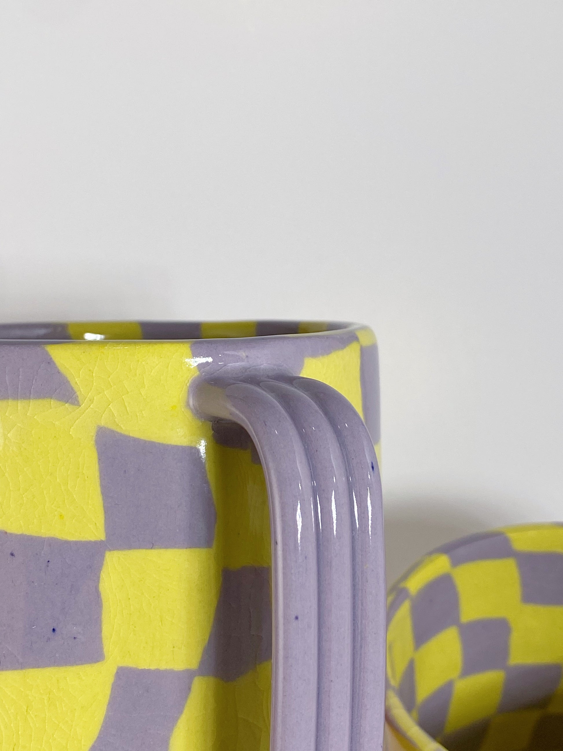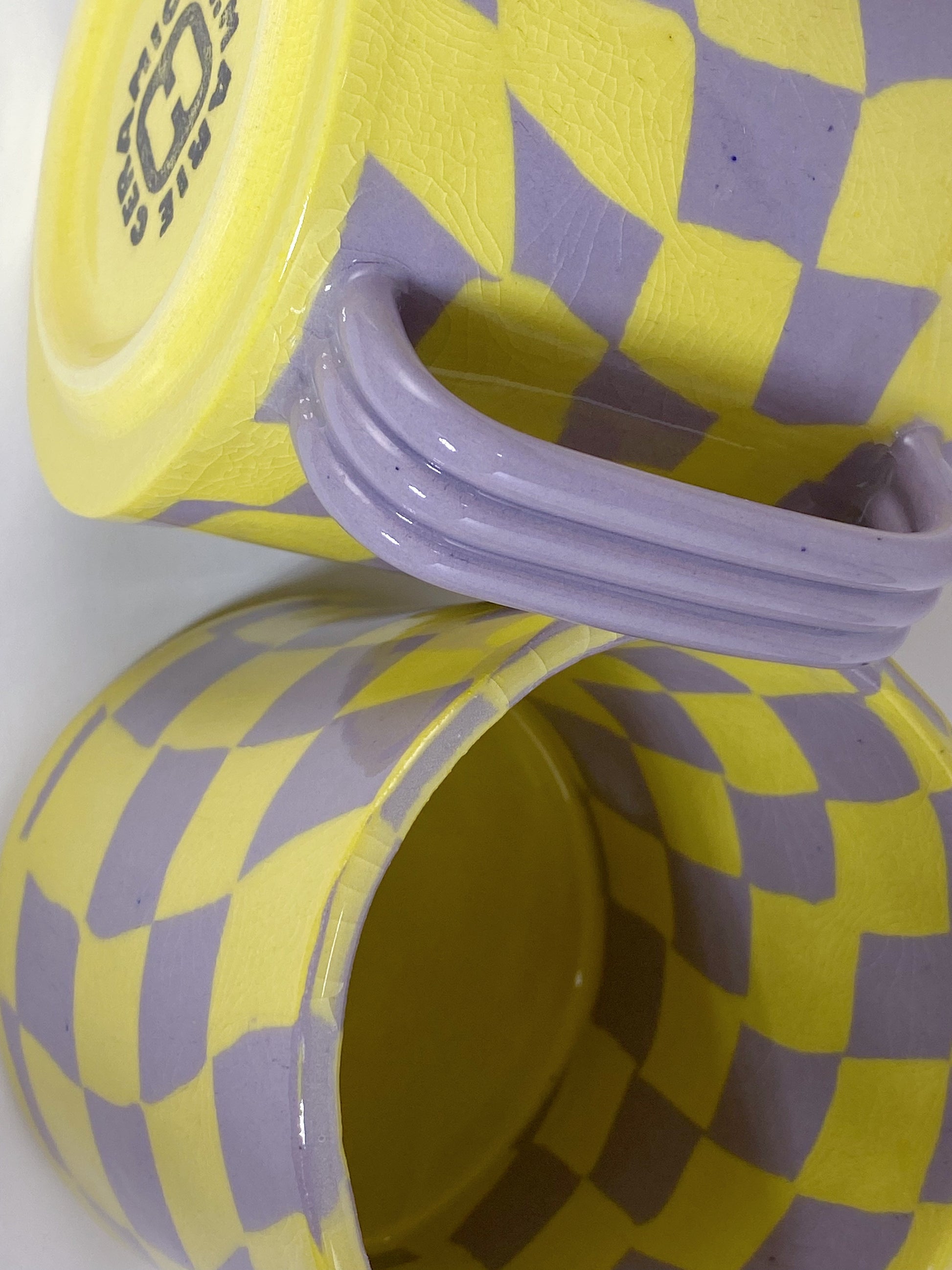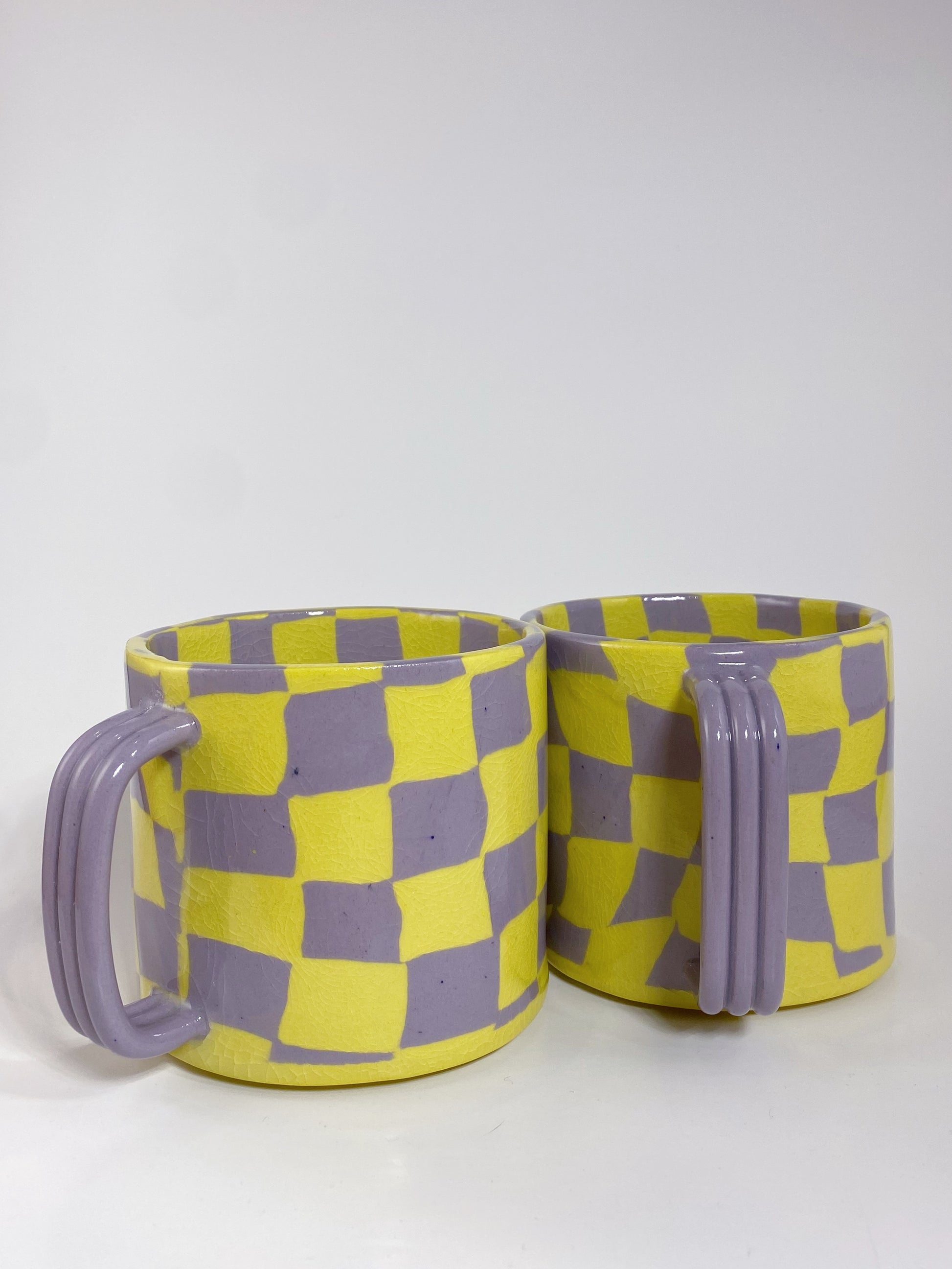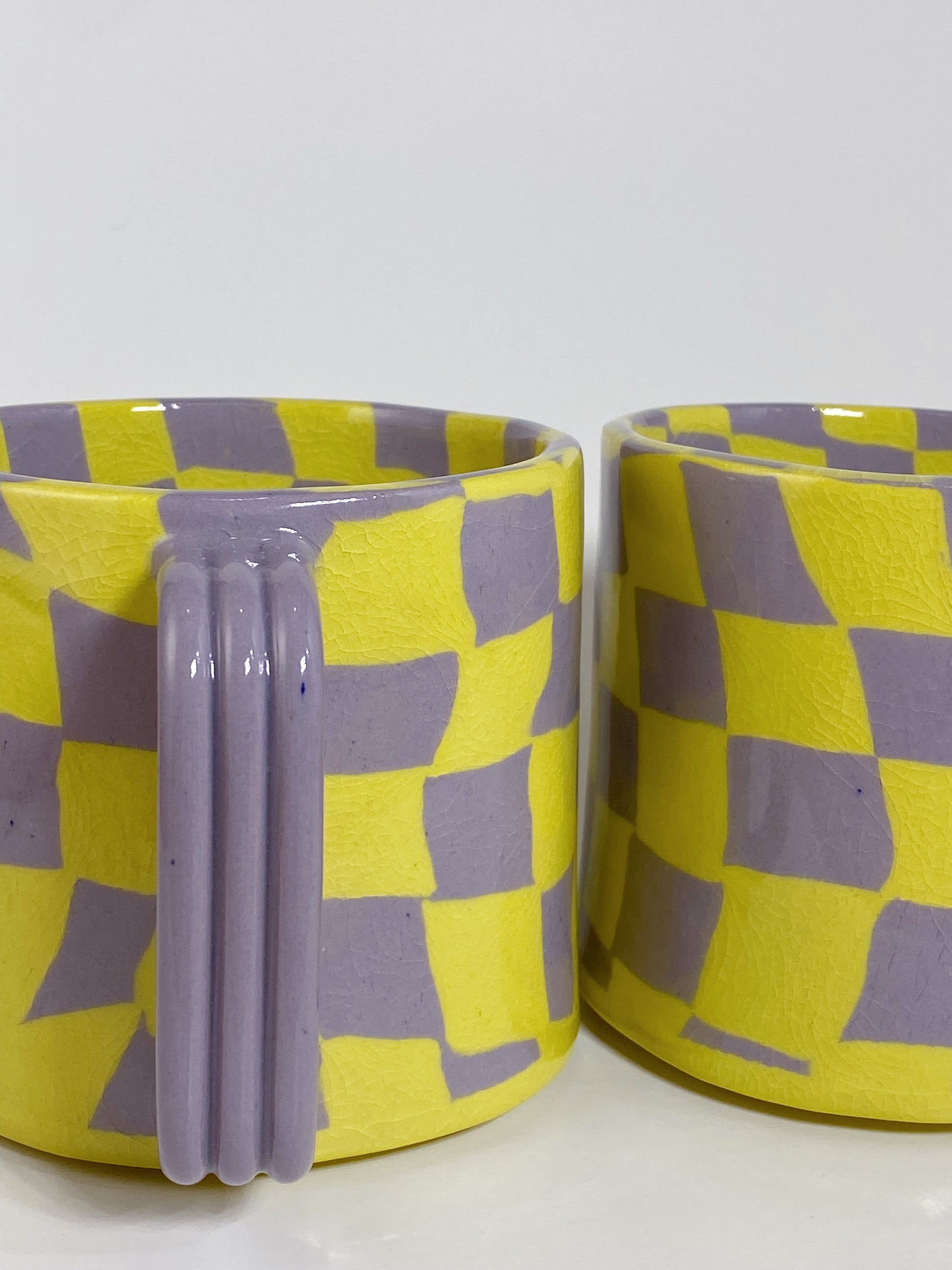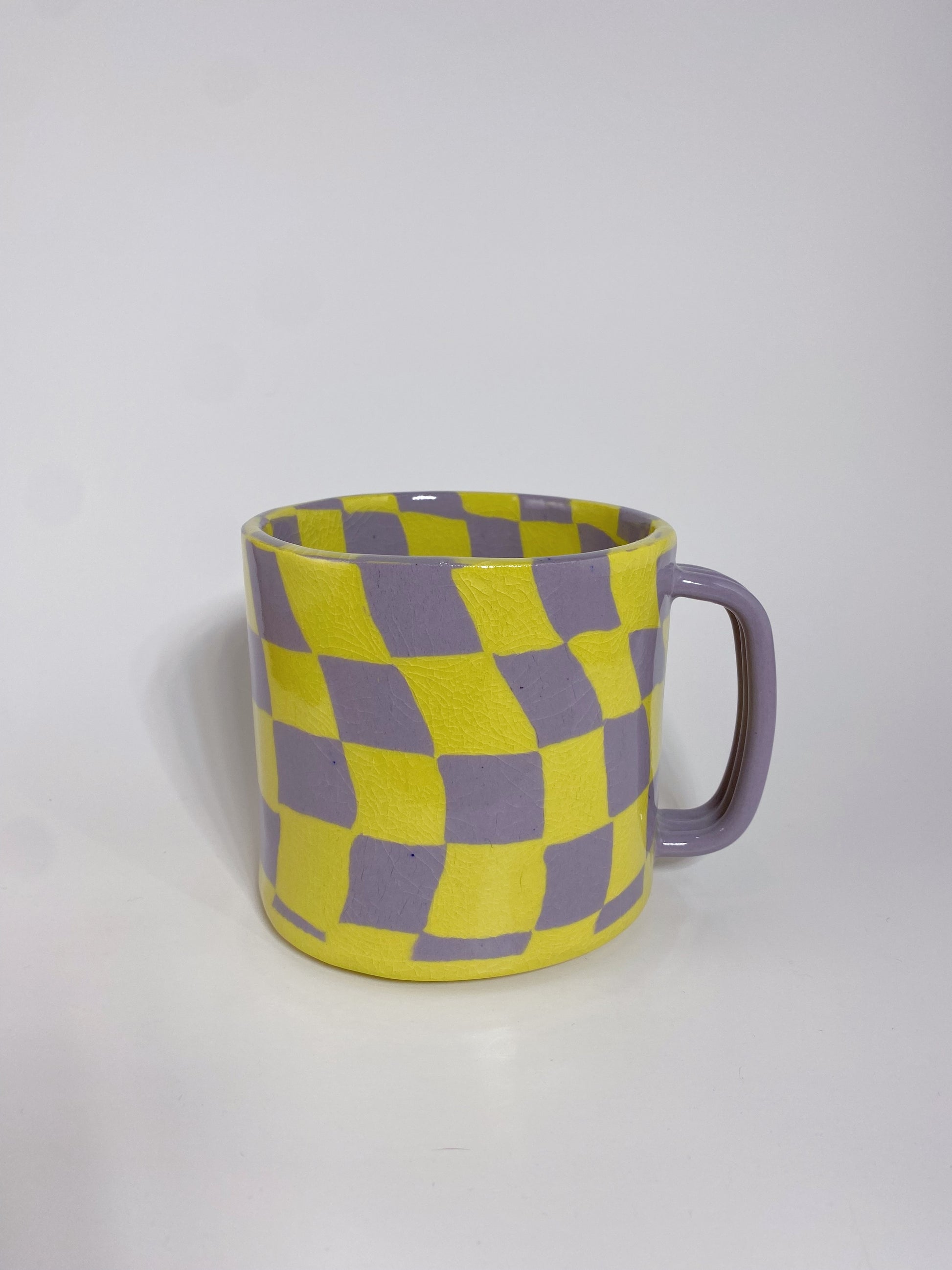 This checkered mug was hand built using yellow & lavender dyed clay. It is clear glazed.