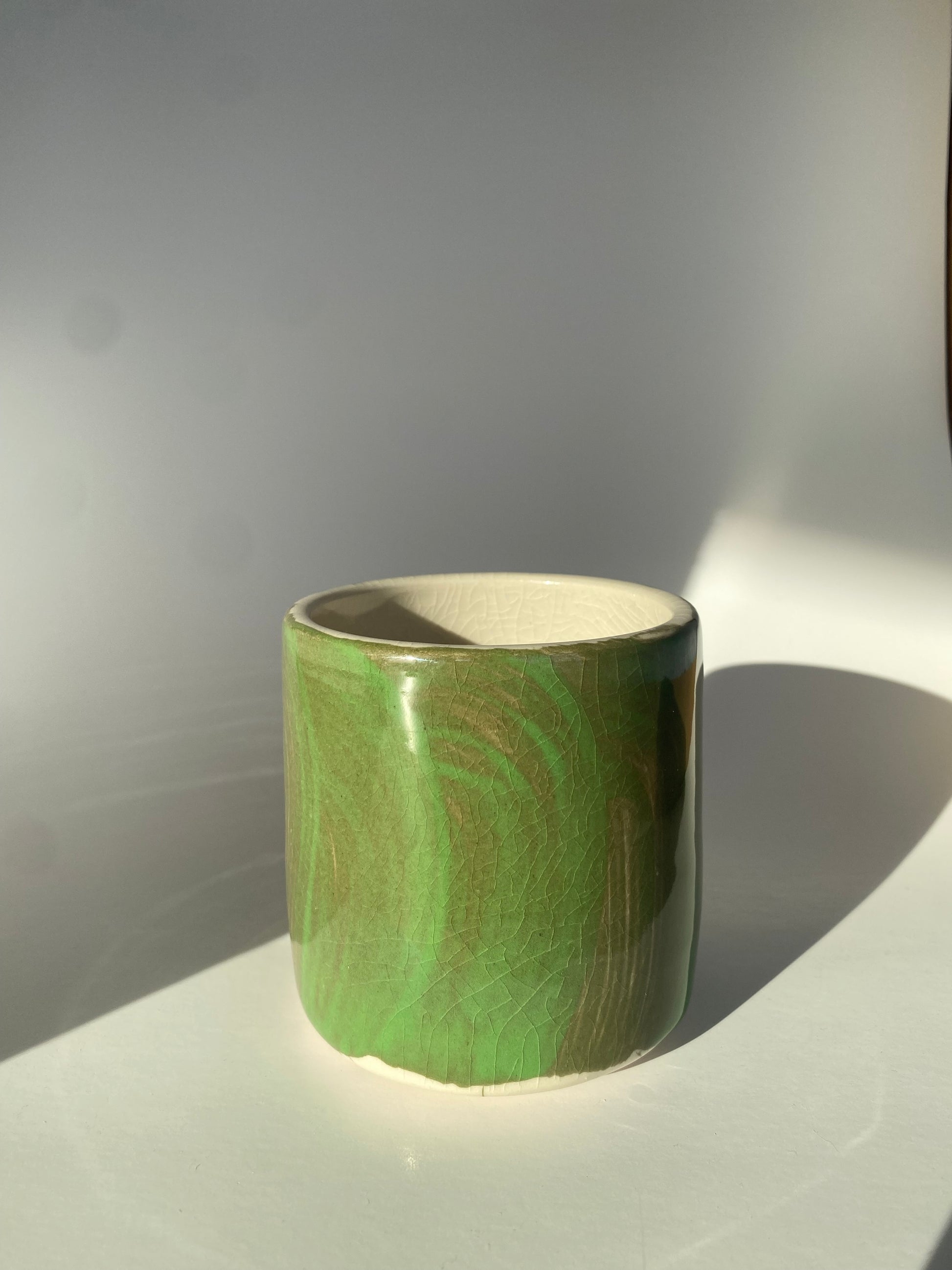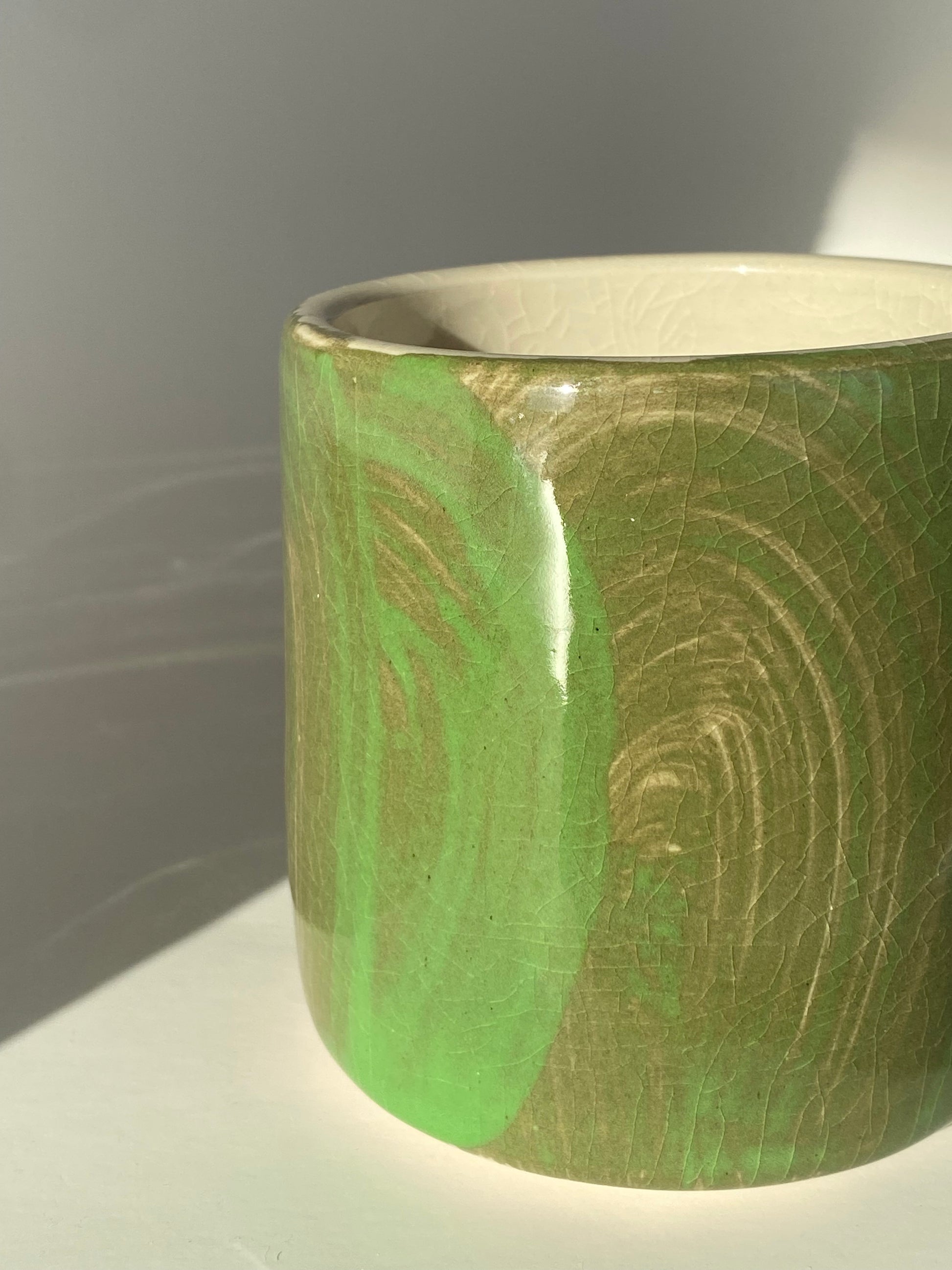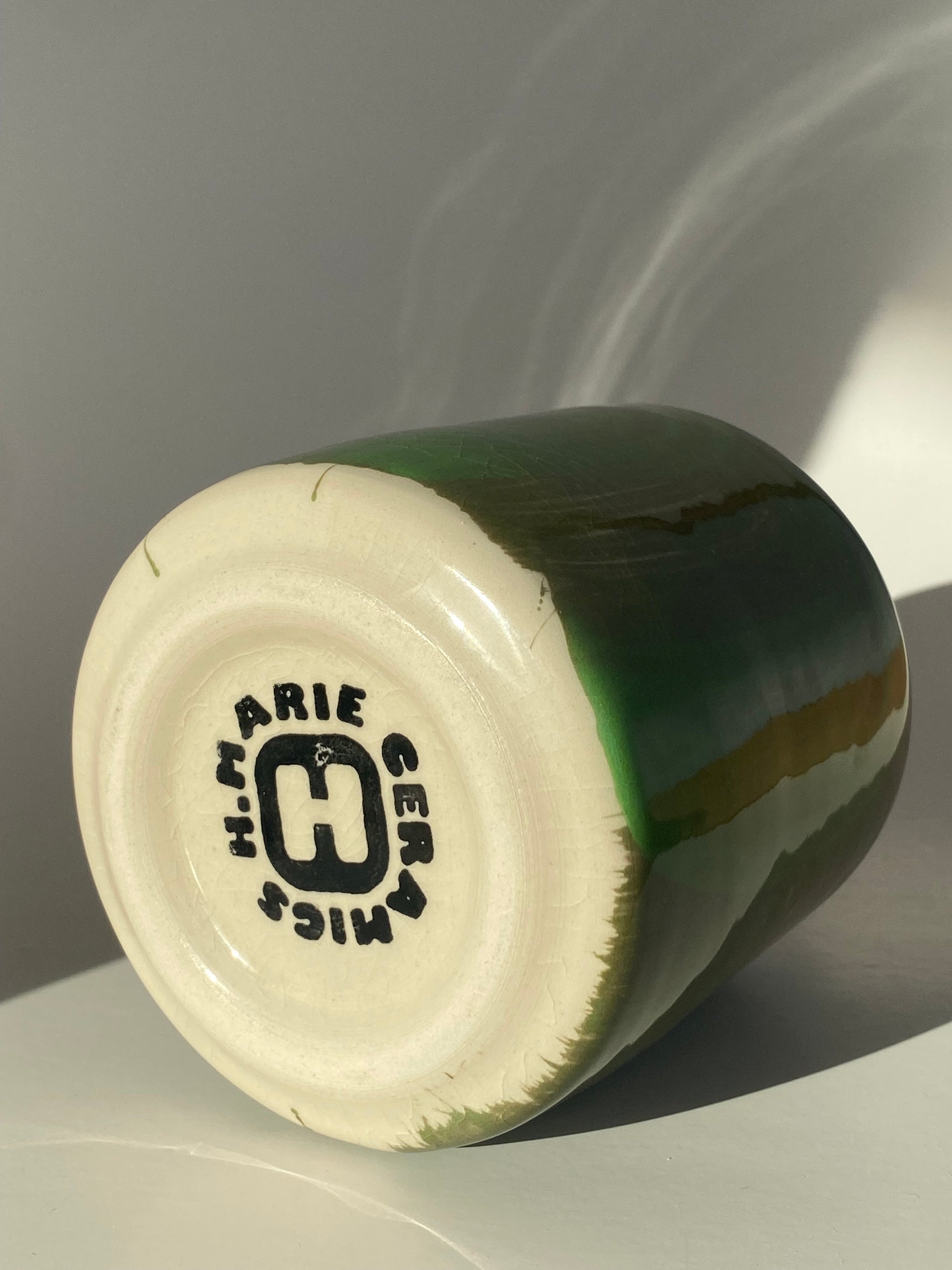 Meet the new kid on the shelf. This tumbler kicks off a fresh line featuring natural clay, modern green tones, and a glossy clear glaze. Grounded, a little bold, and ready for hot or cold drinks alike.